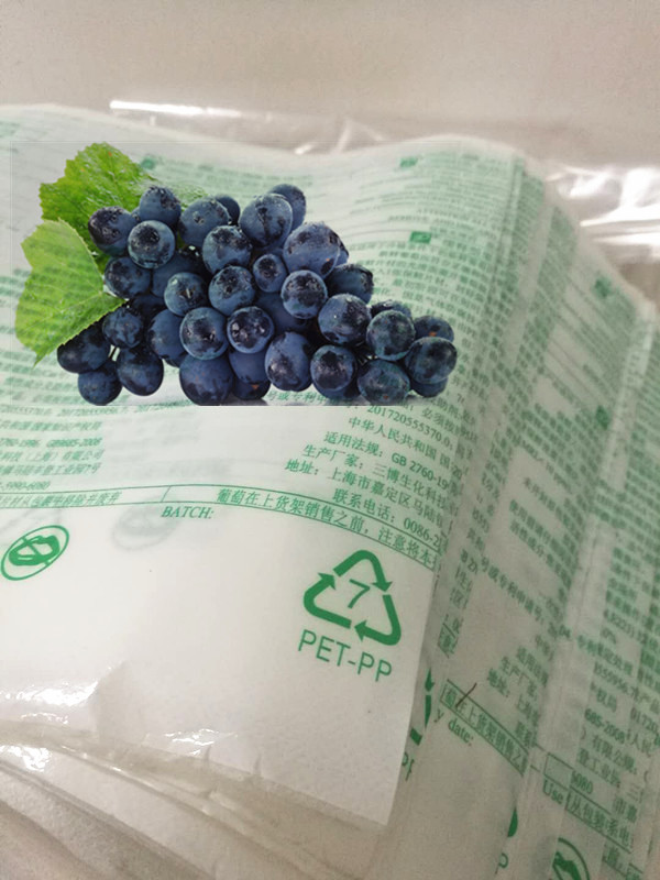 3D 緩釋型葡萄/果蔬保鮮膜是三博生化通過大量實驗研究后,開發(fā)出來的針對葡萄等果蔬保鮮儲存的氣相緩釋保鮮產(chǎn)品。本產(chǎn)品利用氣體緩釋技術(shù),適用于冷鏈條件下的新鮮葡萄等的長途運輸和冷庫中葡萄的保存。3D緩釋技術(shù)分兩段釋放和多段釋放,最初階段可在短時間內(nèi)到達(dá)防腐防霉藥劑濃度,之后緩釋作用使保鮮效果長期化,可冷庫保鮮葡萄3-4月。因是氣體防腐技術(shù),故在開封后防腐劑自行消散。保鮮片材主要由PET,PP,及氣相保鮮劑構(gòu)成,符合國家相關(guān)法規(guī)要求。